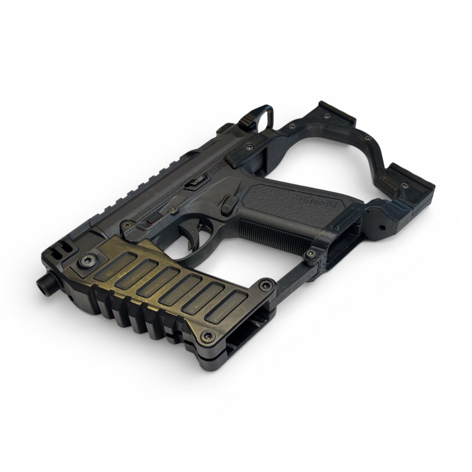 AAP-01C向けに開発されたミリデコオリジナルのフォアグリップは、アサシンにも対応可能なパーツ交換機能を備えています。このフォアグリップは、予備マガジンを内部に収納できるだけでなく、本体グリップ下部とも固定されるため、高い剛性を実現しています。