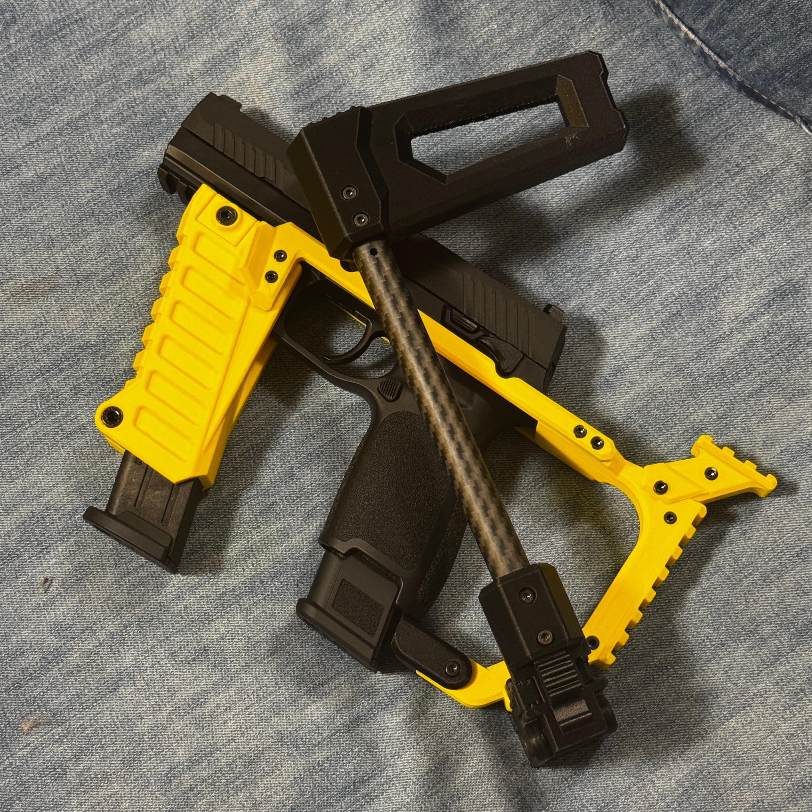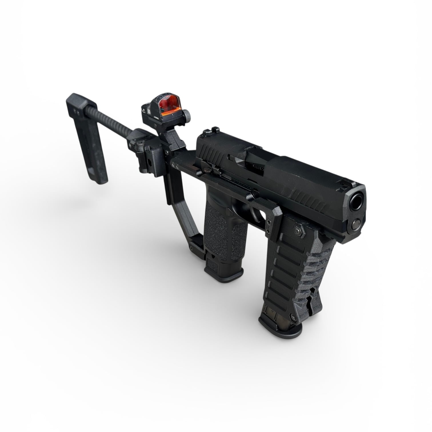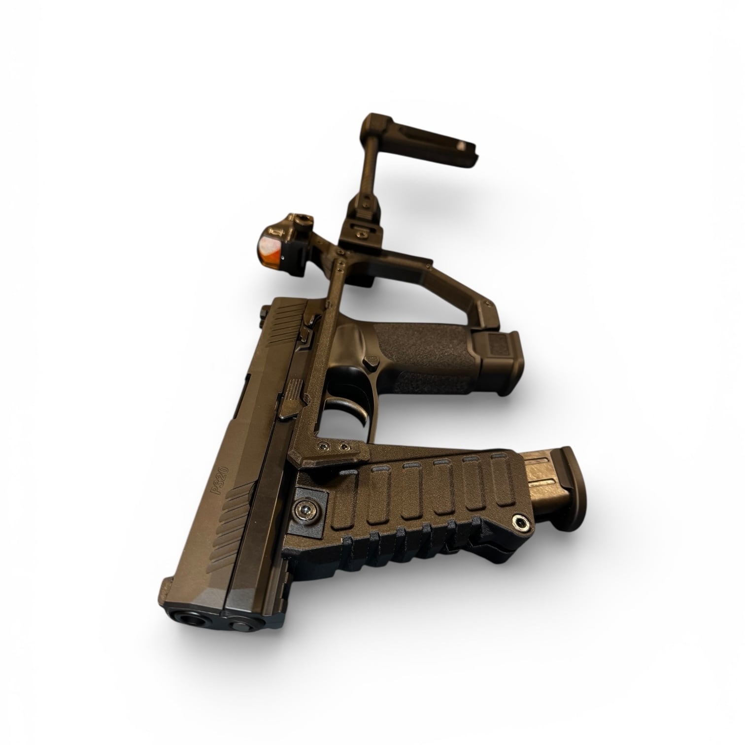 A carbine-style frame system for the Tokyo Marui P320 airsoft pistol, designed to install with no modification to the base gun—no cutting, drilling, or permanent changes required.