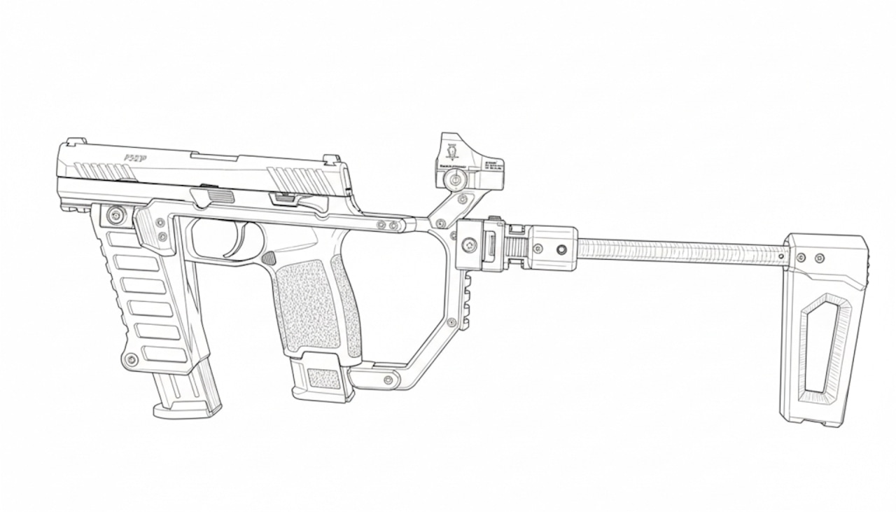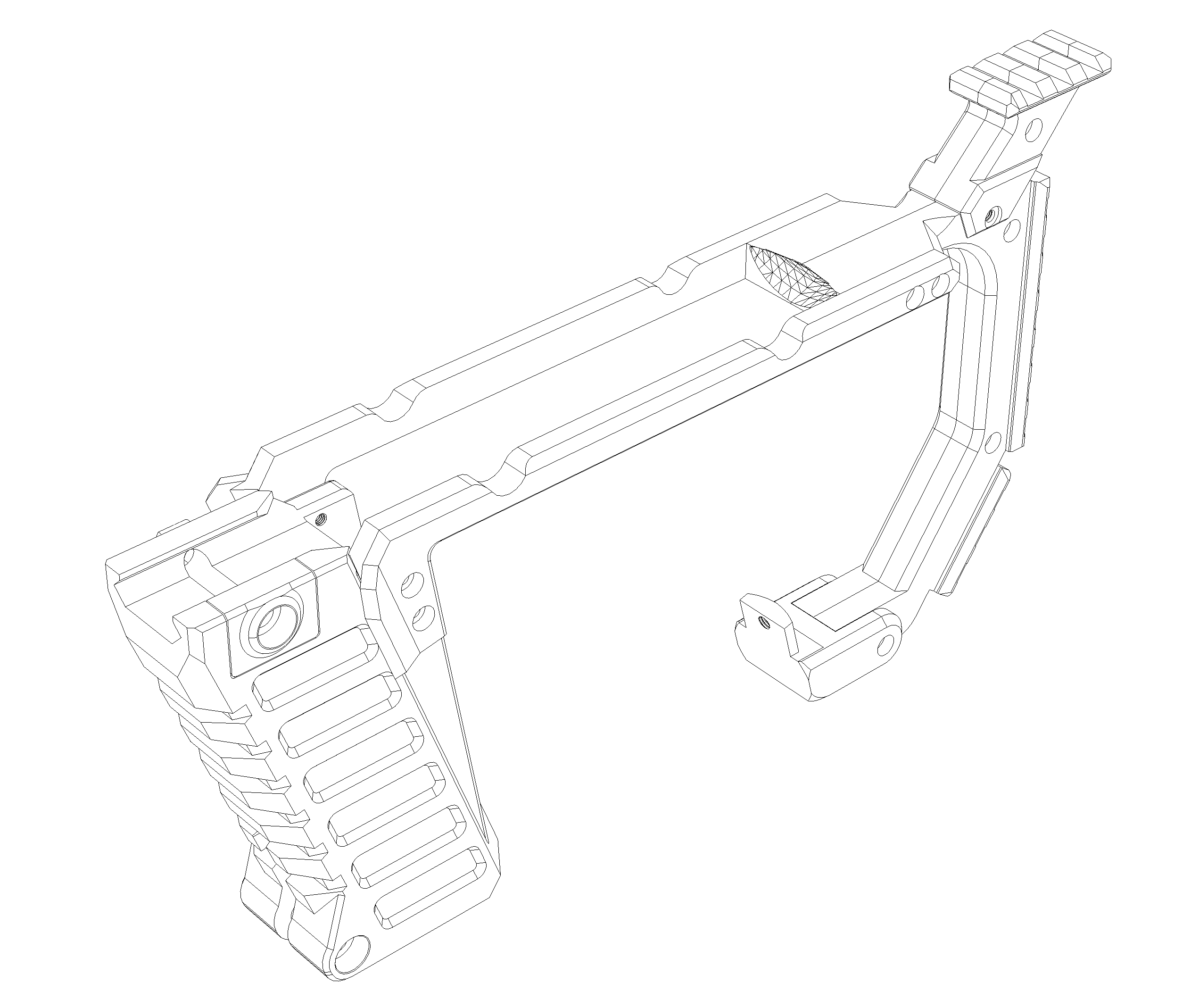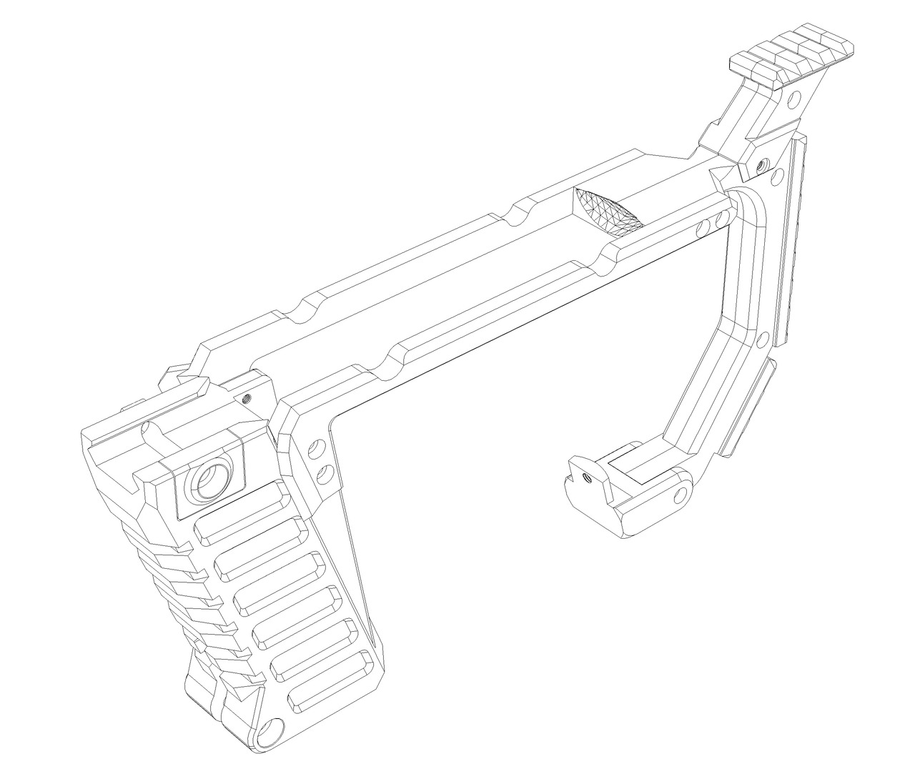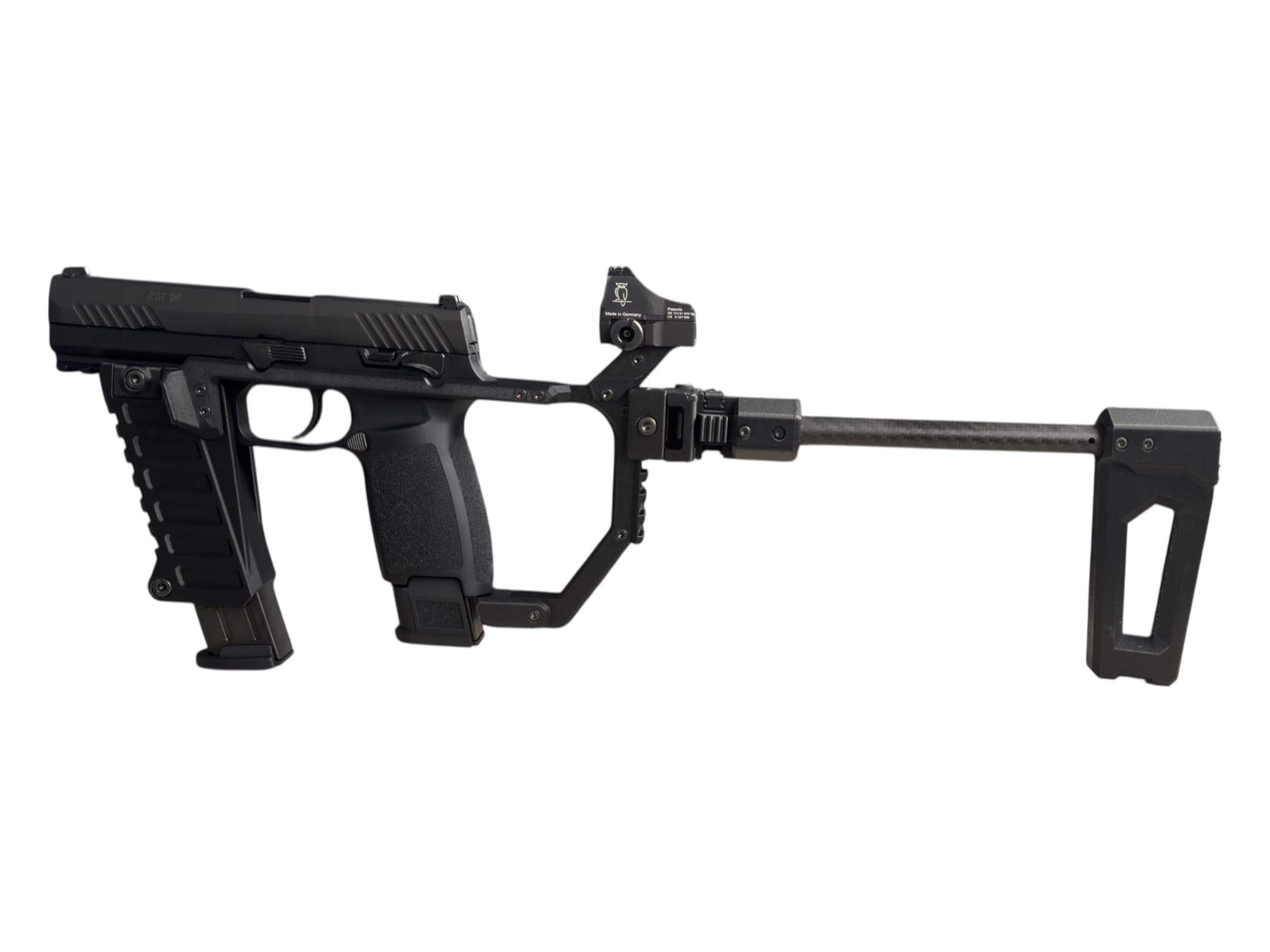 東京マルイ P320 を「本体無加工」でカービンスタイル化するフレームシステムです。差し込んで固定するだけで装着でき、工具が苦手な方でも扱いやすい設計にしています。