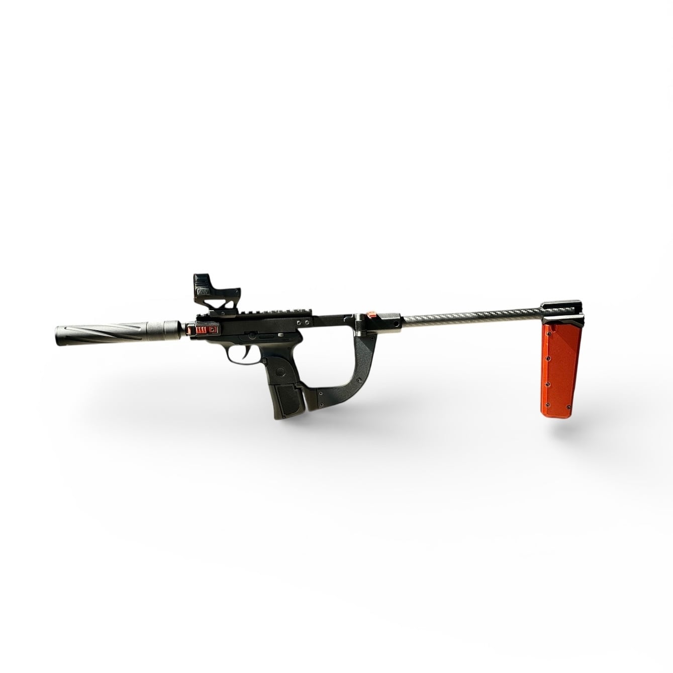 フロントとストック部分は折りたたみ可能で、サプレッサーをつけた状態でも三つ折りにできて、コンパクトに持ち運びができます